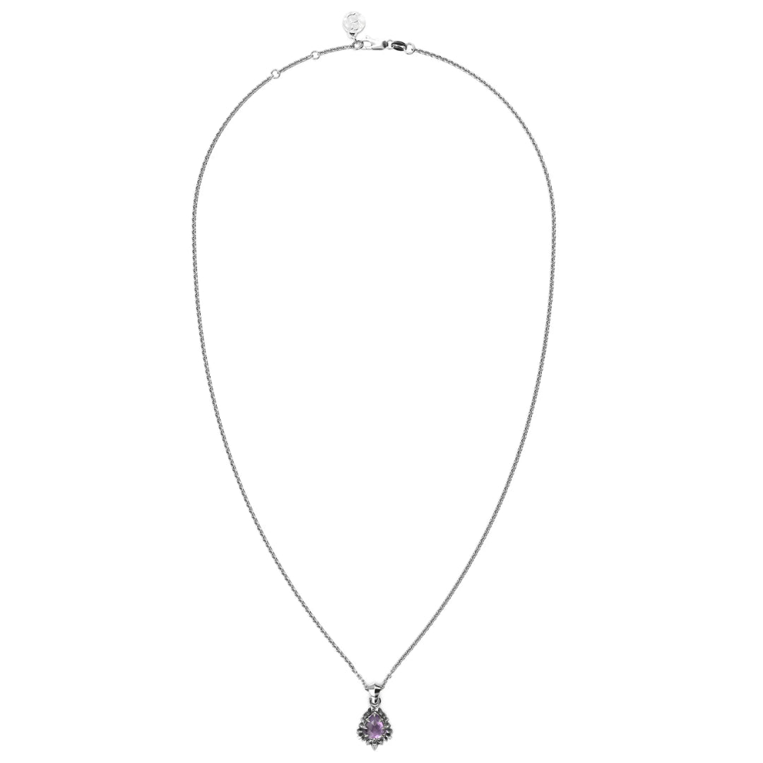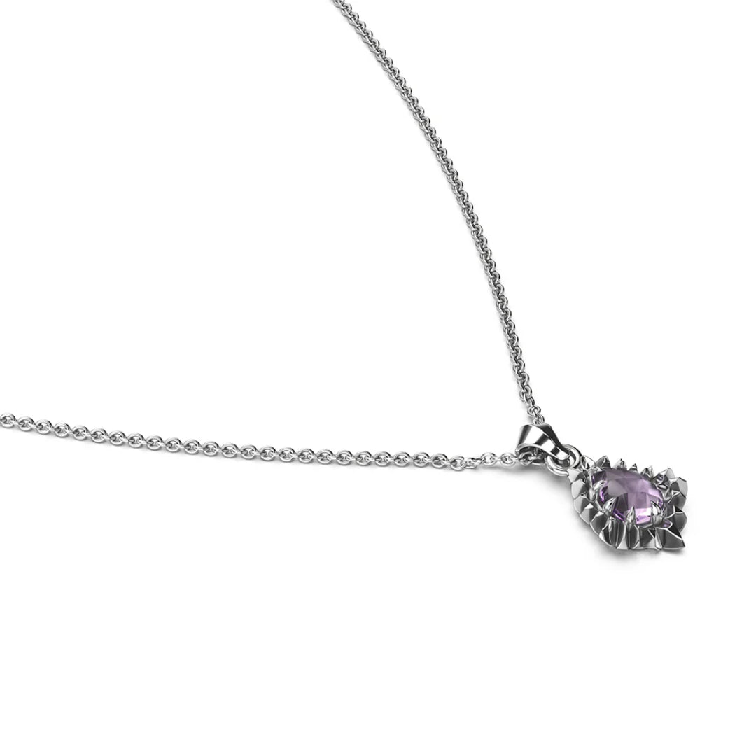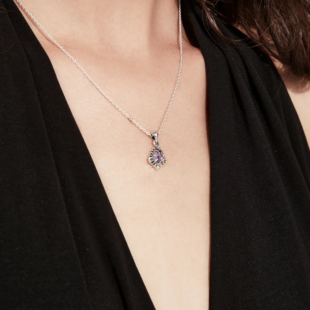 At the centre: a shimmering pear-cut amethyst, framed by a serrated silver bezel. The Jagged Teardrop Necklace balances softness and structure—a romantic gesture edged with complexity. Its fine chain meets the polished pendant with perfect contrast. This piece is crafted from solid sterling silver - A future heirloom, made in limited release.