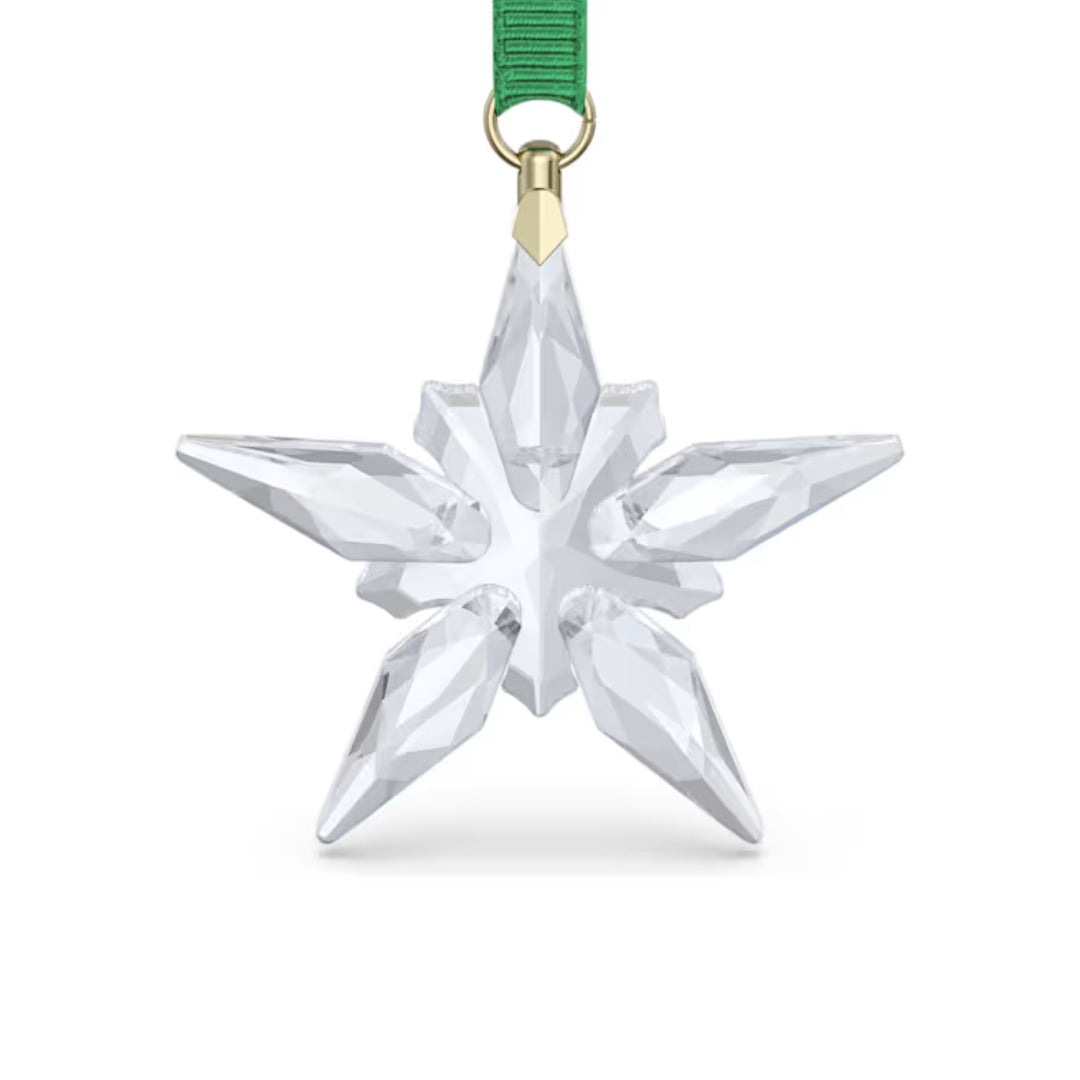 Embrace the wonders of the night sky with this Swarovski Annual Edition Little Star Ornament. Suspended from a green grosgrain ribbon with champagne gold-tone accents, the star-shaped design is precisely cut with 190 facets, beautifully embodying Swarovski’s complex simplicity and technical skill. Perfect for hanging on a festive tree, this delicate ornament provides endless light throughout the holiday season. Decoration object. Not a toy. Not suitable for children under 15.