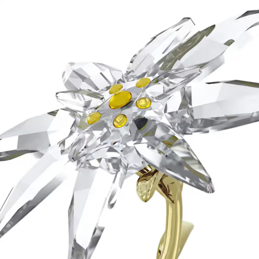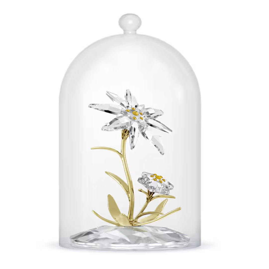 Created to celebrate Swarovski’s 130th anniversary, this wondrous bell jar is dedicated to the original Edelweiss emblem. The flowers themselves reveal a total of 259 precision-cut facets, with yellow pistils, and glossy stems and leaves in champagne gold-tone metal. Protected and displayed beneath a glass bell, this special creation is a showcase of Swarovski’s finest savoir-faire and enduring heritage. Decoration object. Not a toy. Not suitable for children under 15.
