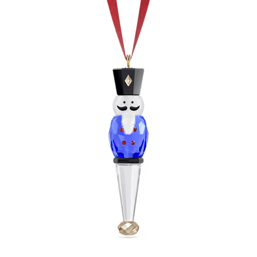 Inspired by one of the season’s most beloved and timeless characters, this crystallised ornament exudes holiday cheer. Crafted with 270 facets, the nutcracker is dressed in a blue coat with delicate red buttons, and is further embellished with a white fabric beard. Suspended from a red grosgrain ribbon, it’s a charming way to bring tradition and joy into your festive décor. Decoration object. Not a toy. Not suitable for children under 15.