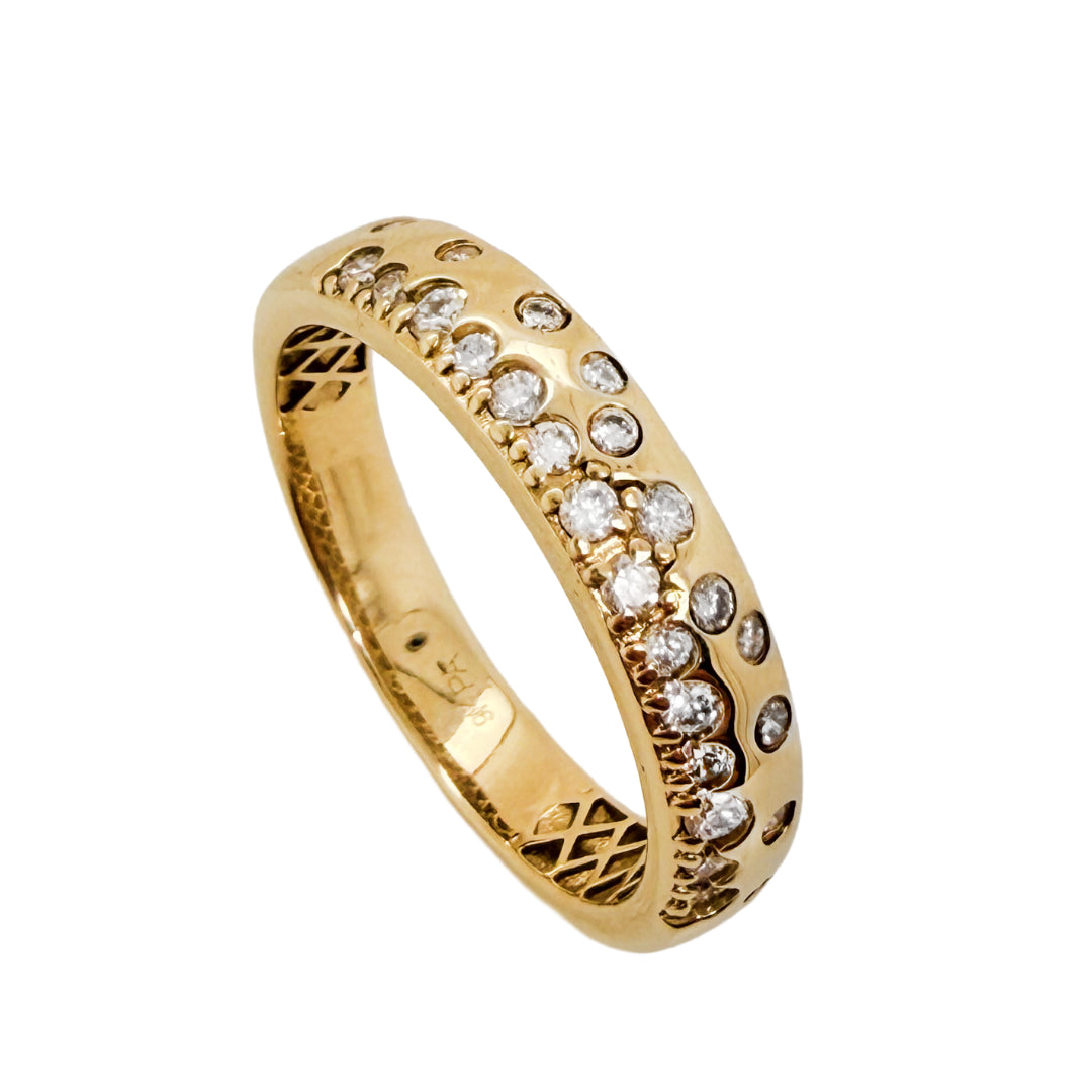 Celebrate life’s sparkle with this 9K yellow gold band featuring a scattering of invisibly set created diamonds. With its softly rounded profile and stunning champagne-like brilliance, this ring radiates joy, elegance, and effortless sophistication.