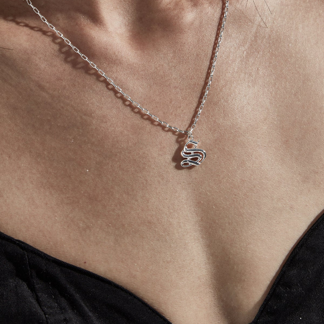Their classic S-logo given a modern update with our sculptural charm in old english script. Suspended on a sterling silver belchor chain.