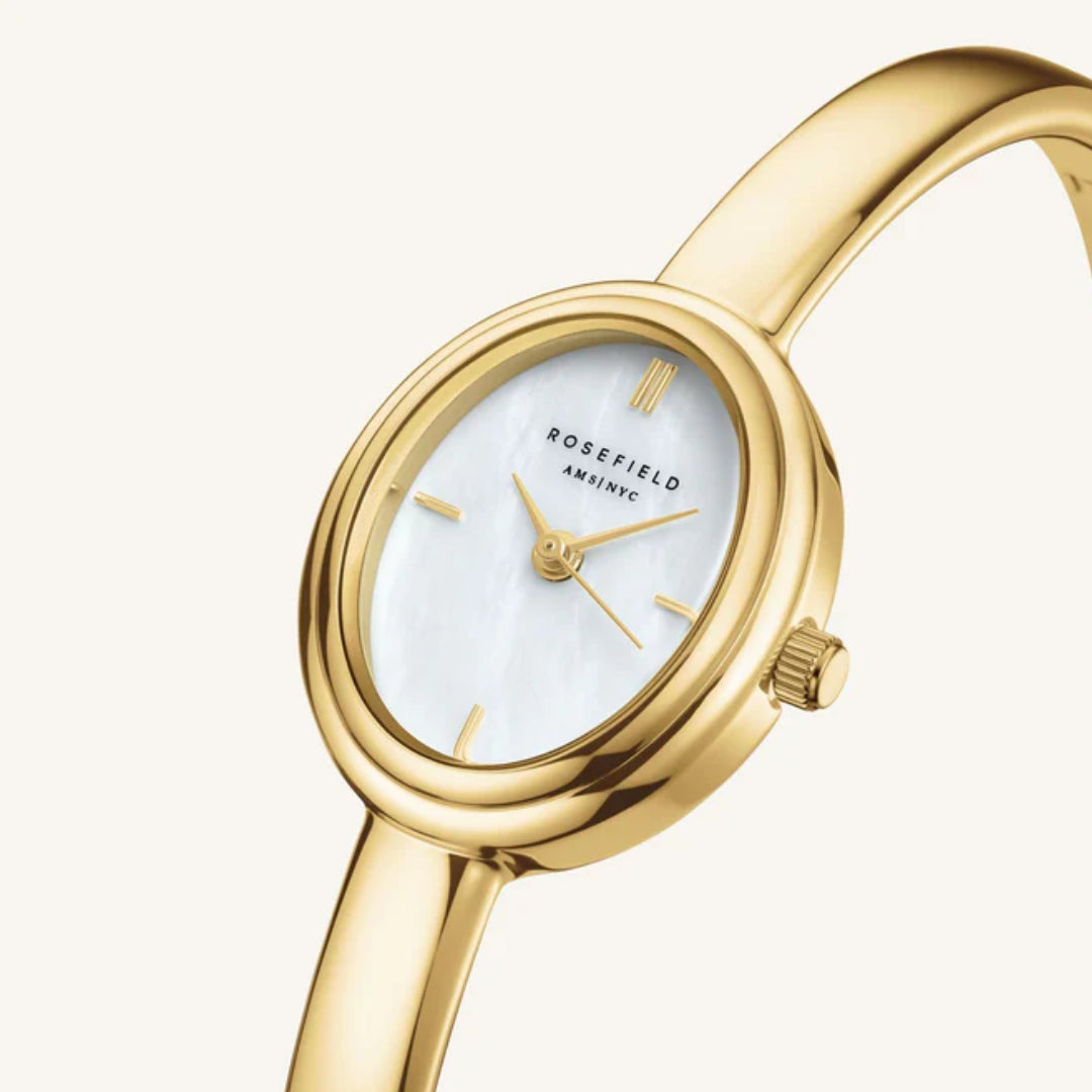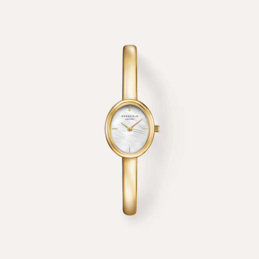 This Rosefield watch is where sleek minimalism meets jewelry-inspired elegance. Featuring a petite oval case in polished gold-plated stainless steel, this timepiece offers a refined silhouette that sits gracefully on the wrist, making it perfect for both everyday wear and special occasions.