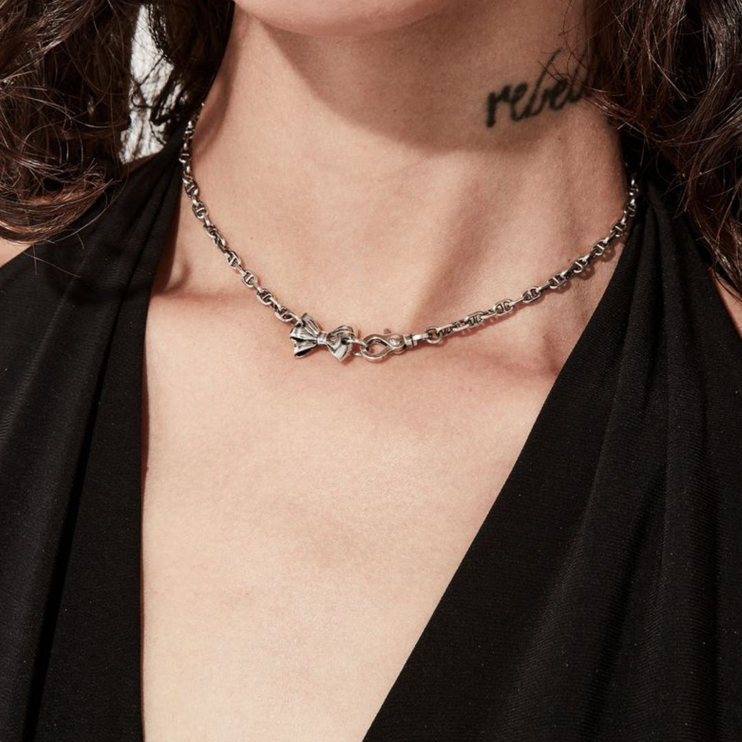The Pierced Bow Necklace by Stolen Girlfriends Club features their signature pierced
