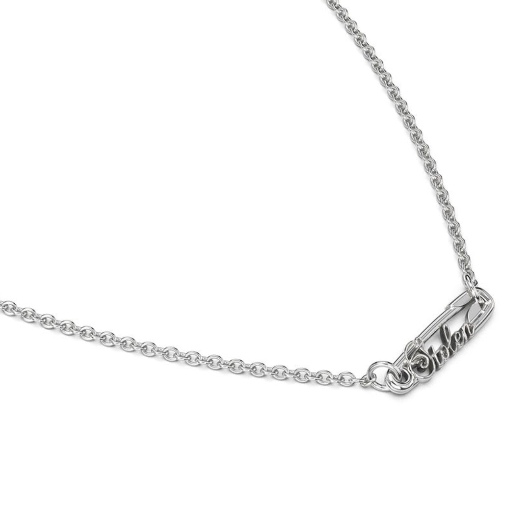 features a sculpted safety pin adorned with signature script tag and suspended from