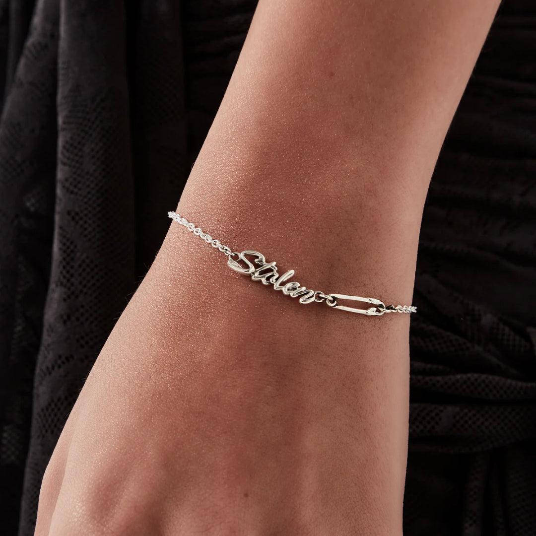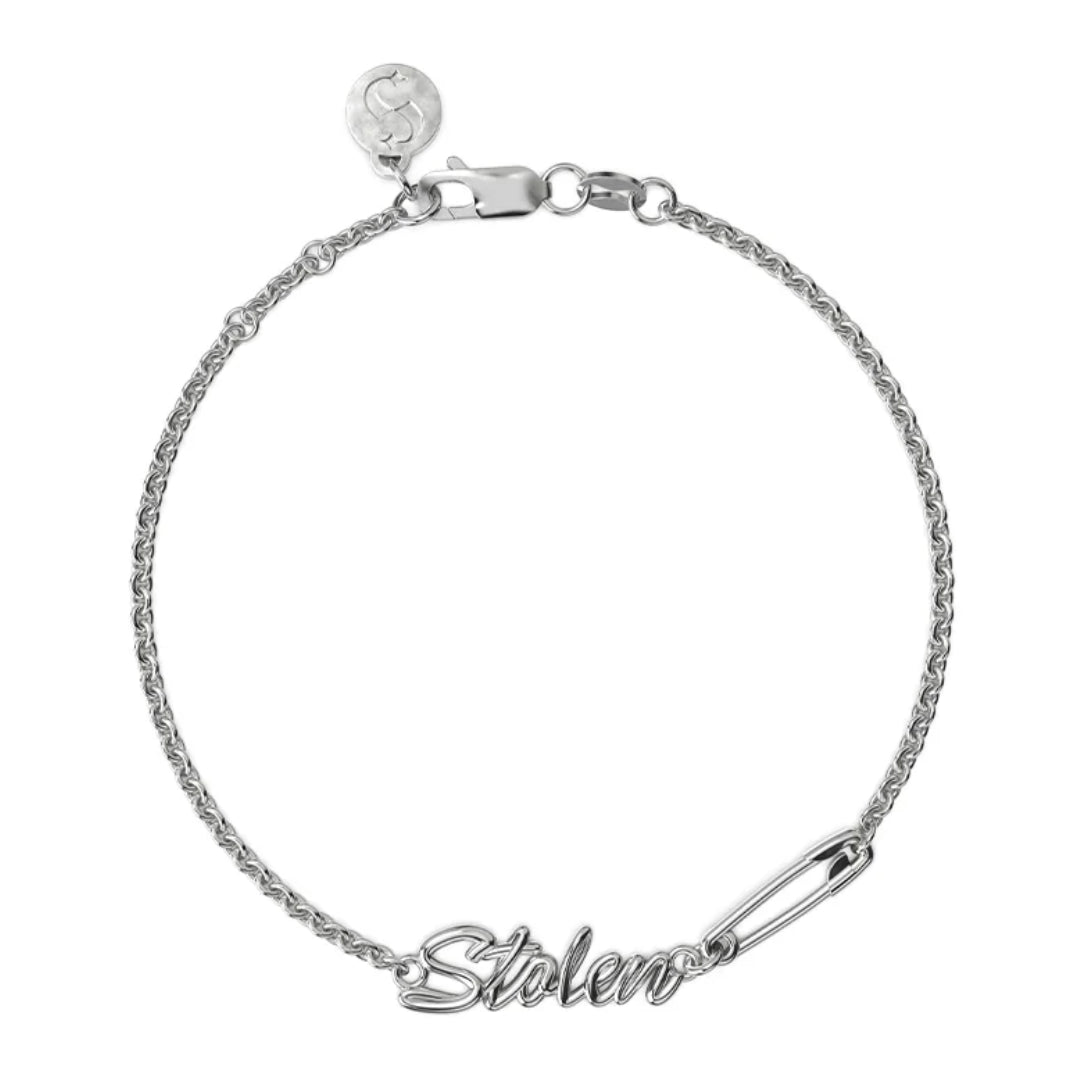 Crafted in solid sterling silver, this bracelet features the signature tubular ‘Stolen’ script anchored to a fine belcher chain. A miniature safety pin adds contrast, movement and design depth, echoing the sculptural tension of the piece.