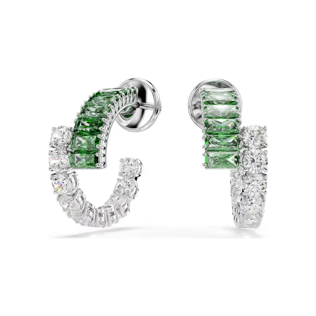 These luxurious Matrix earrings were crafted for a vivid glow. Each small hoop is rhodium plated and features an overlapping design set with clear and green Swarovski Zirconia in round and baguette cuts. A joyful choice for day-to-night styling, these earrings can be paired with a matching ring or bangle to accentuate the colour in your style.
