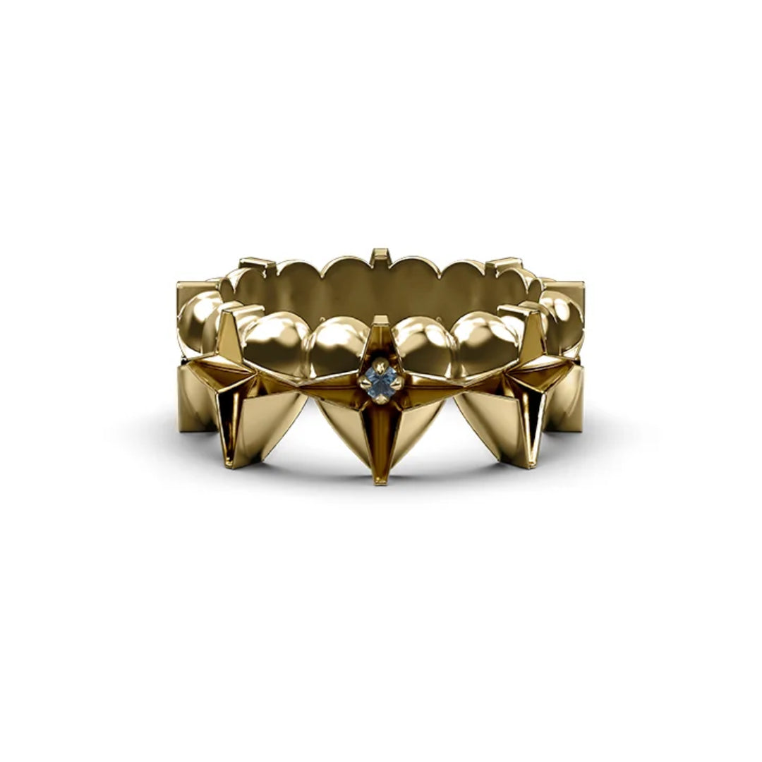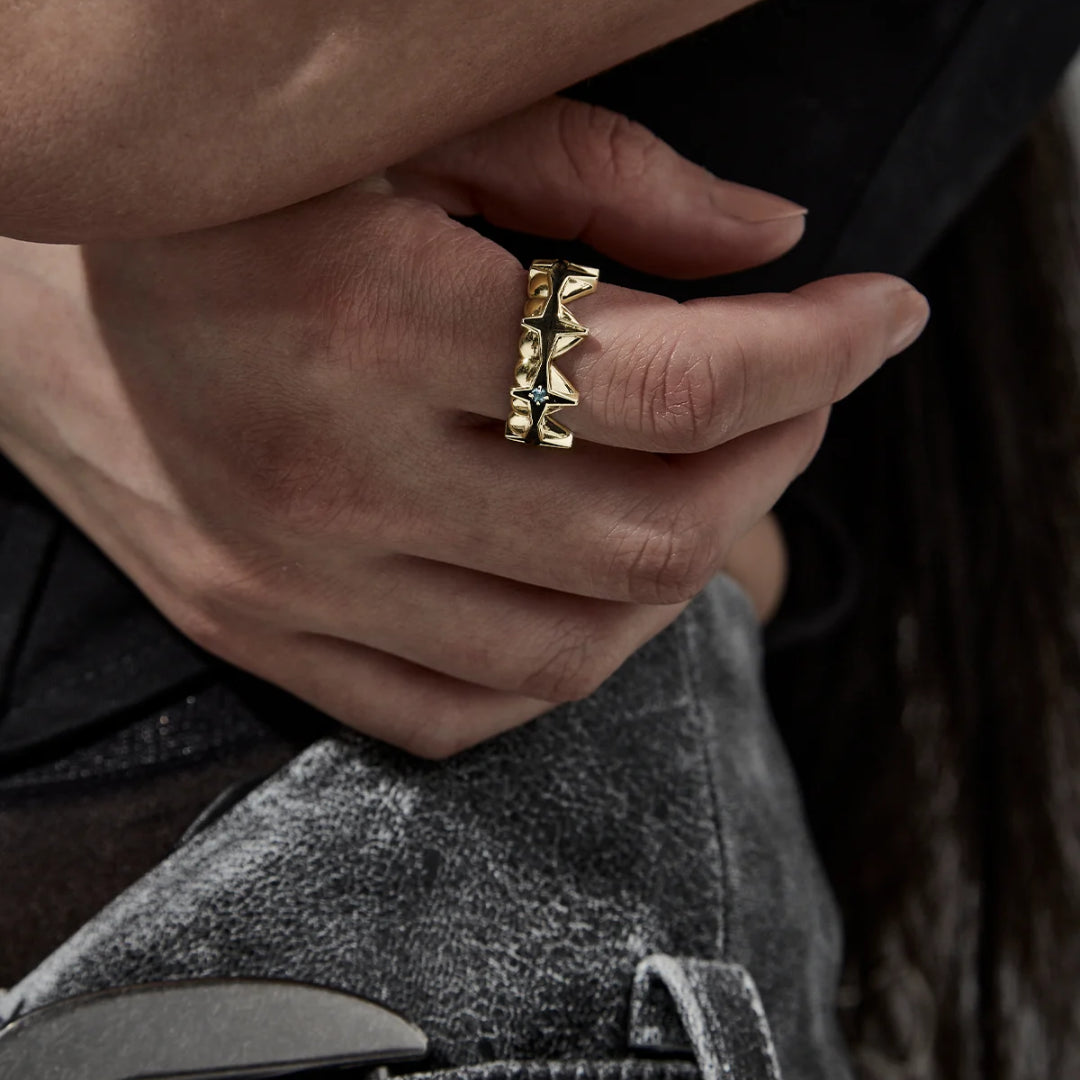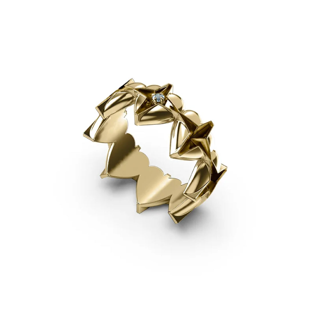 The Celestial Heart Eternity Ring is cast in polished sterling silver, coated in 18k yellow gold plating. Encircling the finger with sculpted hearts and directional stars that symbolise infinite love and inner clarity. Anchored with vibrant Swiss Topaz micro gemstones.