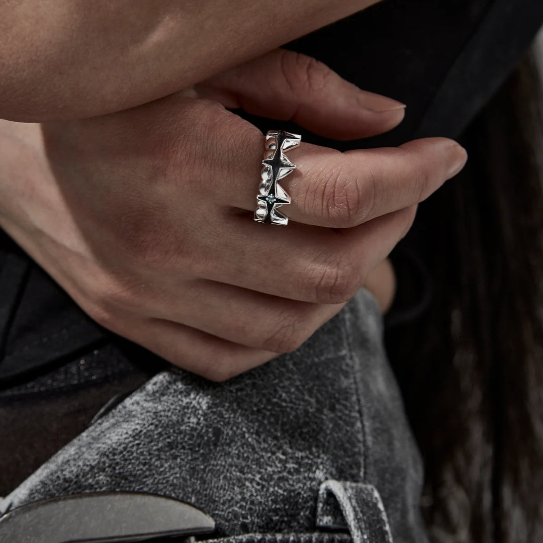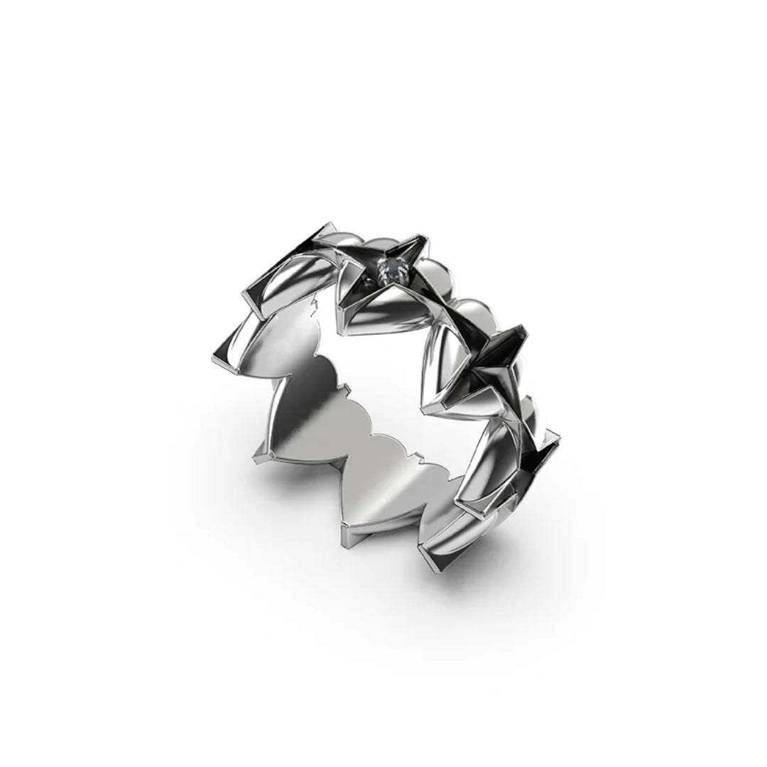 Their Celestial Heart Eternity Ring is cast in polished sterling silver, encircling the finger with sculpted hearts and directional stars - Symbolising infinite love and inner clarity. Anchored with vibrant Swiss Topaz micro gemstones and dark oxidised detailing.